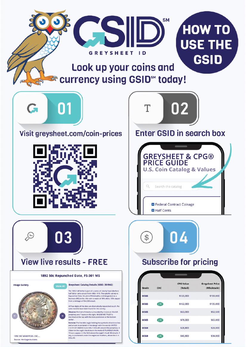 The Greysheet ID (GSID) is a proprietary numbering system developed by Greysheet (Whitman Brands) to provide a unique, universal identifier for every type of United States coin and currency note.