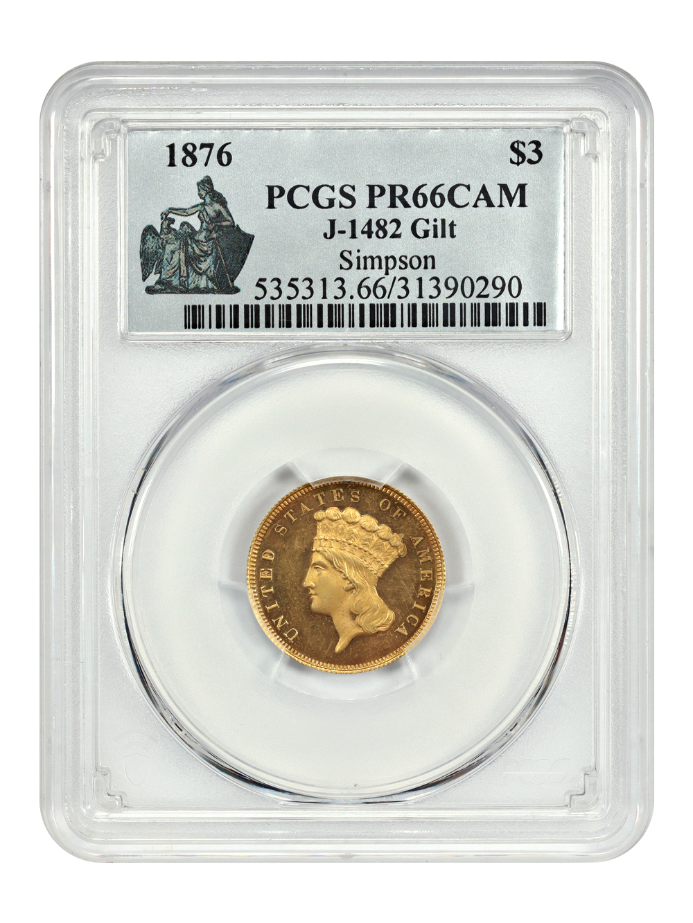 1876 Gilt Copper, J-1482 P$3 PCGS PR66 CAM
