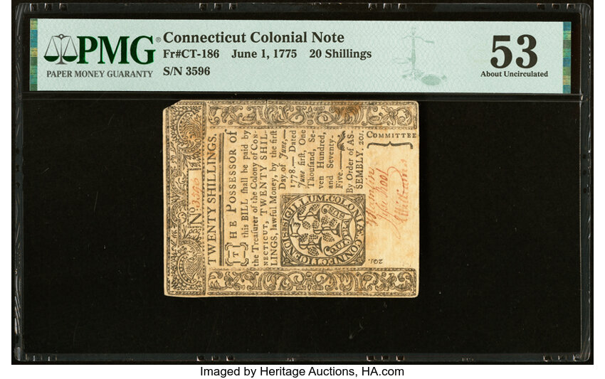 Jun 1, 1775 Connecticut 20s PMG AU53 (Fr. CT186)