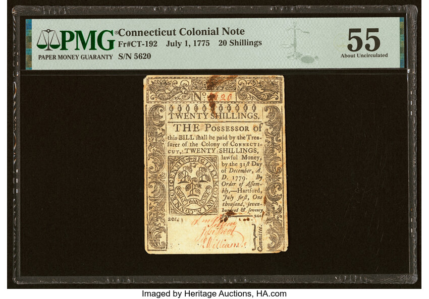Jul 1, 1775 Connecticut 20s PMG AU55 (Fr. CT192)