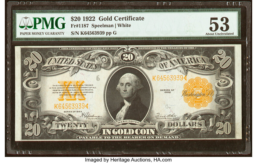 1922 $20 PMG AU53 (Fr. 1187)