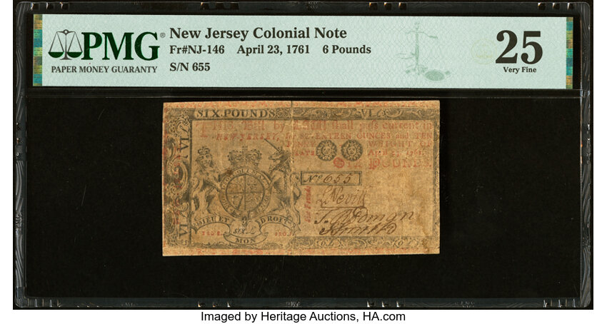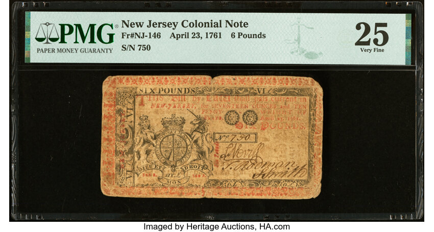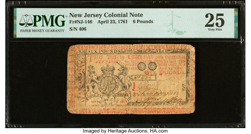 Apr 23, 1761 New Jersey £6 PMG VF25 (Fr. NJ146)
