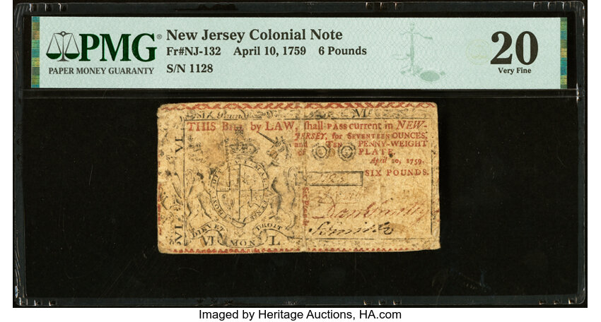 Apr 10, 1759 New Jersey £6 PMG VF20 (Fr. NJ132)