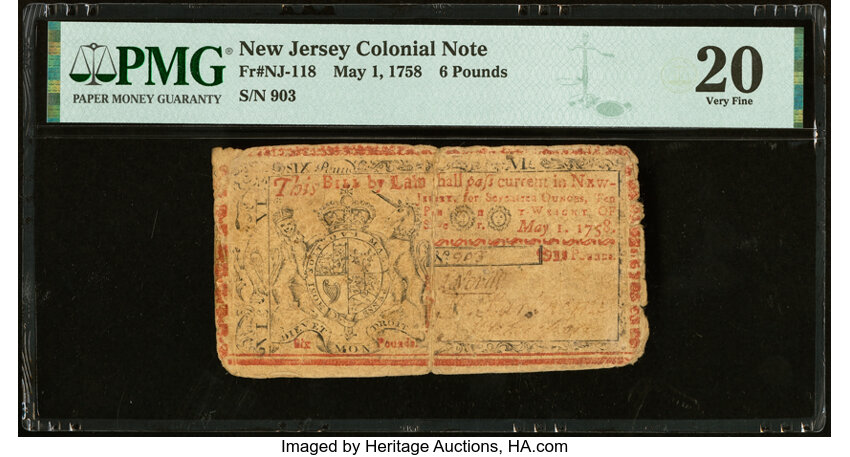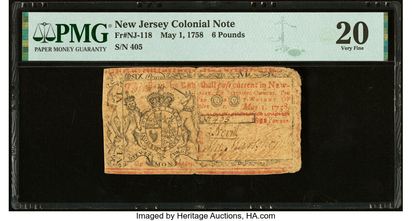 May 1, 1758 New Jersey £6 PMG VF20 (Fr. NJ118)