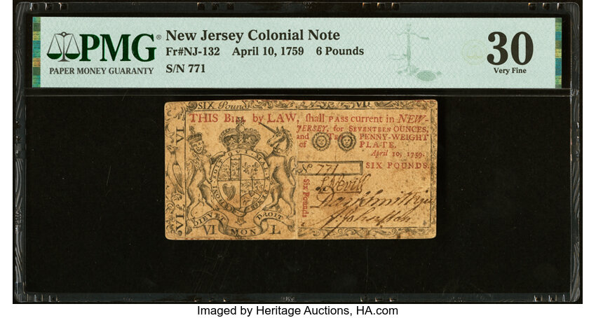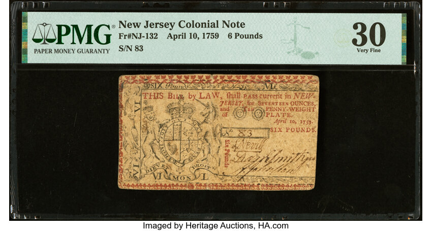 Apr 10, 1759 New Jersey £6 PMG VF30 (Fr. NJ132)