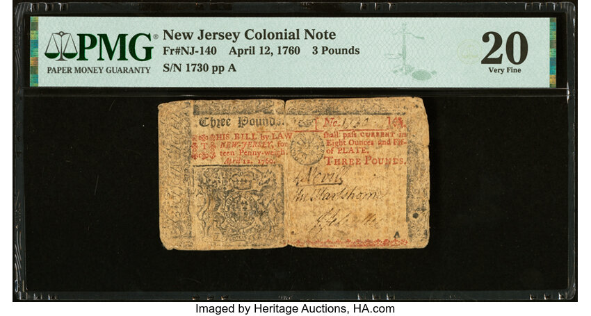 Apr 12, 1760 New Jersey £3 PMG VF20 (Fr. NJ140)