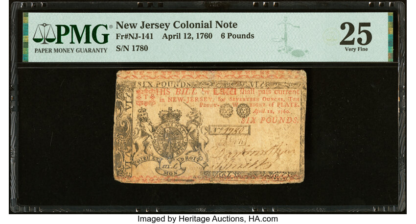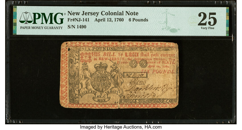 Apr 12, 1760 New Jersey £6 PMG VF25 (Fr. NJ141)