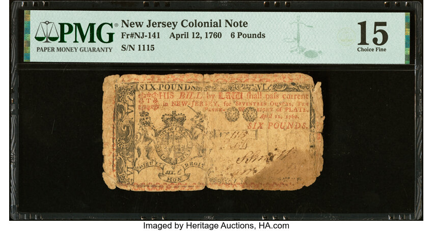 Apr 12, 1760 New Jersey £6 PMG F15 (Fr. NJ141)