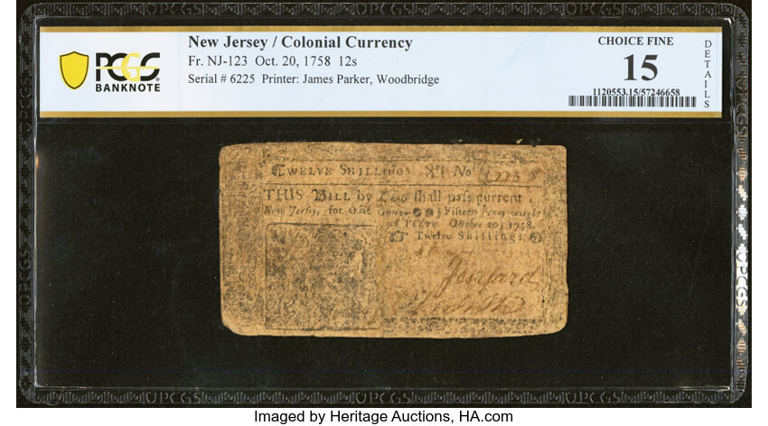 Oct 20, 1758 New Jersey 12s PCGS F15 (Fr. NJ123)