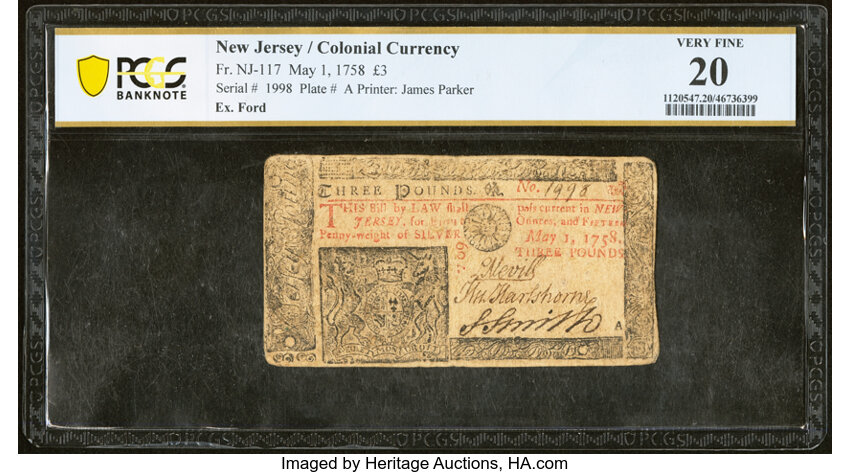 May 1, 1758 New Jersey £3 PCGS VF20 (Fr. NJ117)
