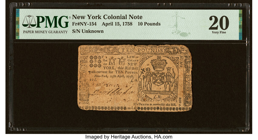 Apr 15, 1758 New York £10 PMG VF20 (Fr. NY154)