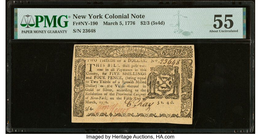 Mar 5, 1776 New York $2/3 PMG AU55 (Fr. NY190)
