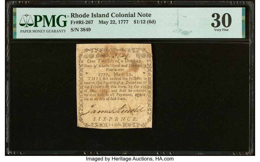 May 22, 1777 Rhode Island $1/12 PMG VF30 (Fr. RI267)