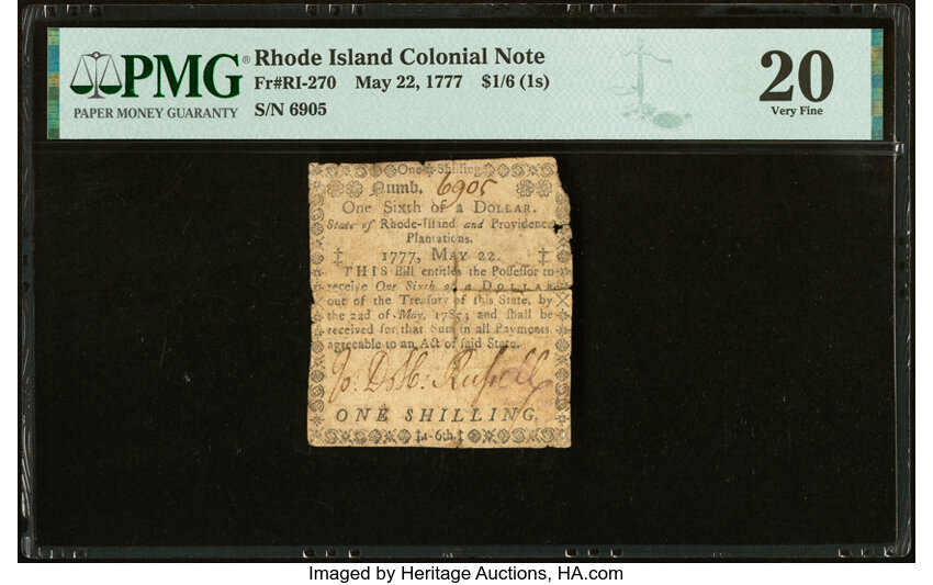 May 22, 1777 Rhode Island $1/6 PMG VF20 (Fr. RI270)