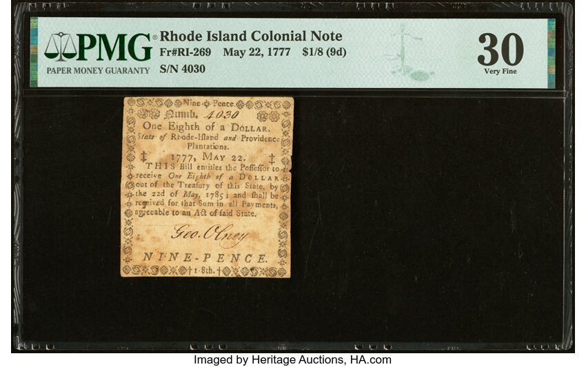 May 22, 1777 Rhode Island $1/8 PMG VF30 (Fr. RI269)