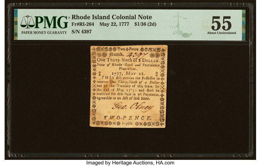 May 22, 1777 Rhode Island $1/36 PMG AU55 (Fr. RI264)