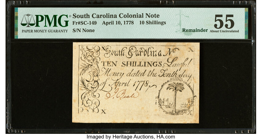 Apr 10, 1778 South Carolina 10s PMG AU55 (Fr. SC149)