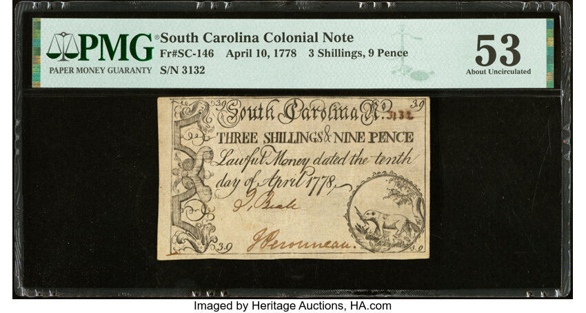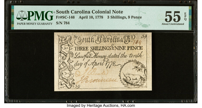 Apr 10, 1778 South Carolina 3s9d PMG AU55 (Fr. SC146)