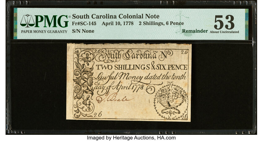 Apr 10, 1778 South Carolina 2s6d PMG AU53 (Fr. SC145)
