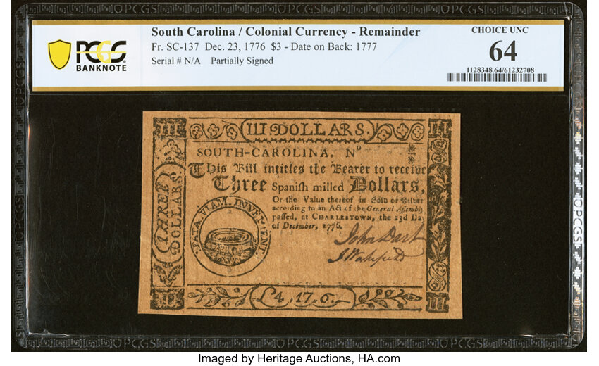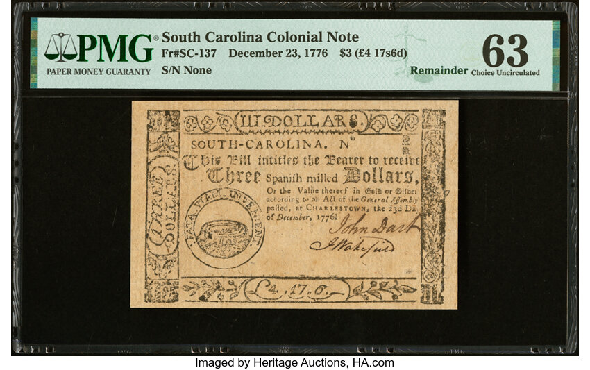 Dec 23, 1776,1777 on the back South Carolina $3 PMG CU63 (Fr. SC137)