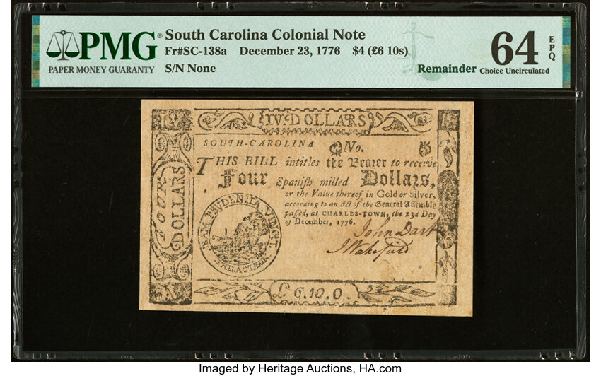 Dec 23, 1776,1777 on the back South Carolina $4 PMG CU64 (Fr. SC138a)
