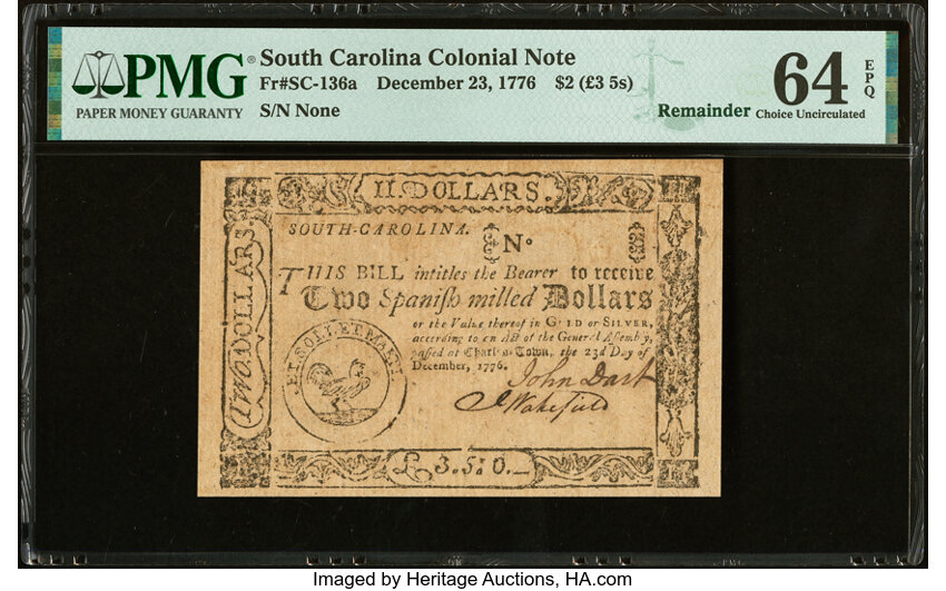 Dec 23, 1776,1777 on the back South Carolina $2 PMG CU64 (Fr. SC136a)