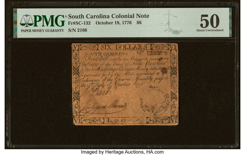 Oct 19, 1776 South Carolina $6 PMG AU50 (Fr. SC132)