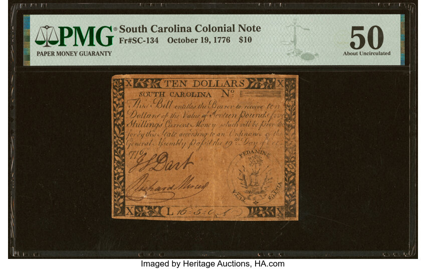 Oct 19, 1776 South Carolina $10 PMG AU50 (Fr. SC134)