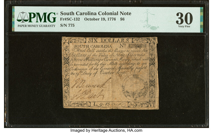 Oct 19, 1776 South Carolina $6 PMG VF30 (Fr. SC132)