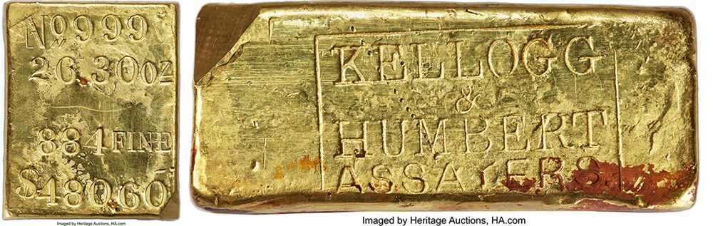A Kellogg & Humbert Gold Ingot from the S.S. Central America, which weighs in at 26.30 troy ounces, has a serial number that is among the highest for the KH-02 mold from the shipwreck. Many Kellogg & Humbert ingots ended up in the melting pot, either at the San Francisco Mint or after being shipped via steamboat to New York banks. The ingots recovered from the S.S. Central America shipwreck provide a detailed look at this prolific firm’s assaying practices.