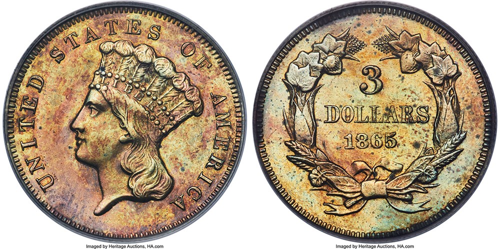 The 85 lots in this collection are all gold, except for a single vibrantly colorful copper pattern, an 1865 Judd-441 Three Dollar, PR63 Brown PCGS. Other top offerings from the collection include, but are not limited to: