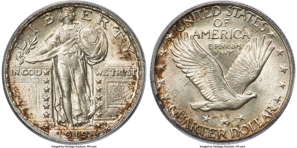 A 1919-D Quarter, MS66 Full Head PCGS is one of nearly two dozen lots in the auction from The Big Sky Collection of Standing Liberty Quarters, Part I. The finest 1919-D quarters typically available to collectors grade MS66 Full Head, and there are only 12 such coins reported at PCGS and NGC combined (one of which is Plus-designated, and only a single PCGS coin is finer in Full Head), making this Registry-grade rarity a remarkable example of this challenging date. It is believed that this example has not been offered to the collecting community since it was offered at Heritage in 2012. This auction marks just the 11th time, and the fourth time in the last decade, that a 1919-D in this grade has been offered at Heritage.