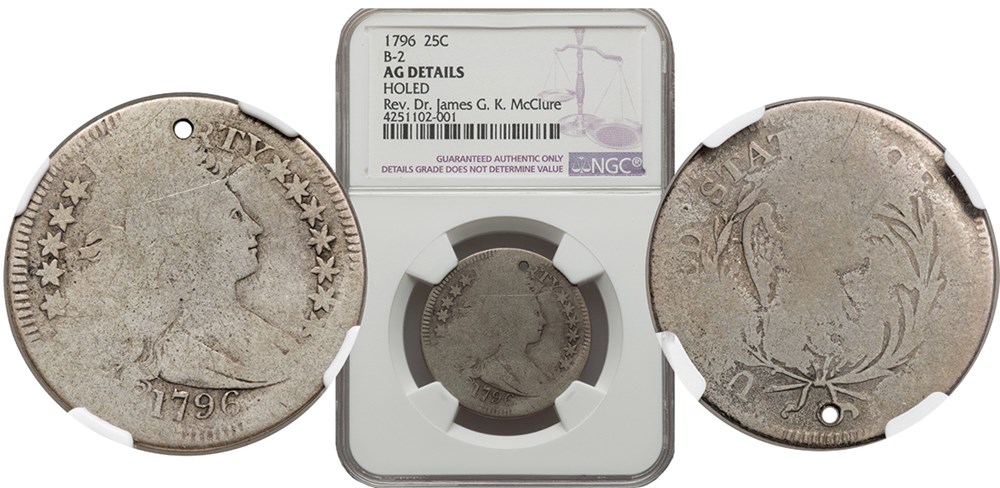 1796 Draped Bust Quarter Dollar, AG-3, Holed, NGC. Sold June 9, 2016 for $3,055.00 by Heritage Auctions.