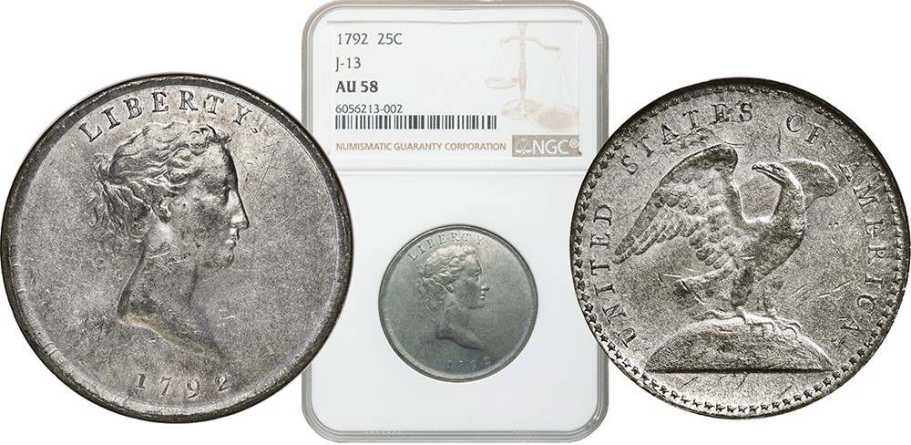 1792 Judd-13 White Metal Quarter, AU58, NGC. Sold April 24, 2021 for $1,260,000.00 by Heritage Auctions.