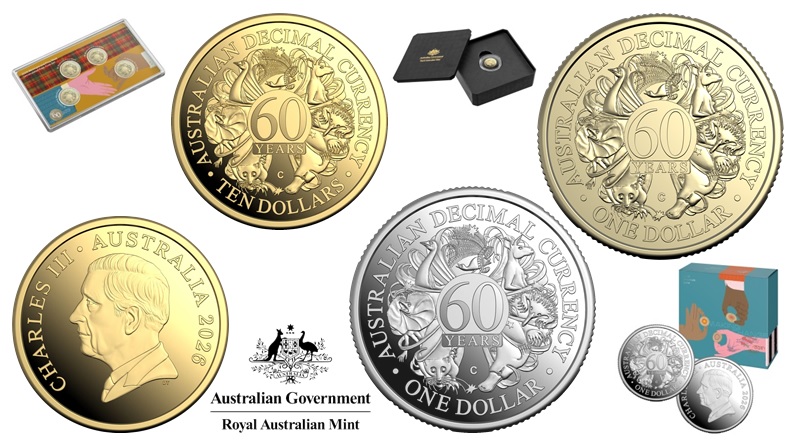 Included is the sugar glider possum depicted on the one cent coin, frilled-neck lizard seen on the two cent coin, the echidna seen on the five cent coin, the lyrebird seen on the ten cent coin, a platypus included on the twenty cent coin and the emu along with the kangaroo and Southern Cross crest found on the fifty cent coin. Centred is the numeral 60 and text YEARS. The primary design is surrounded with the text AUSTRALIAN DECIMAL CURRENCY placed along the rim and the denomination TEN DOLLARS (gold) or ONE DOLLAR (base metal and silver) is shown below. All of these depictions are united in one focal design as part of a nostalgic tribute to the changeover that defined the Australian nation. The obverse side features the effigy of HM King Charles III designed by Daniel Thorne along with the year of issue, 2026 as part of the legend surrounding the royal portrait.