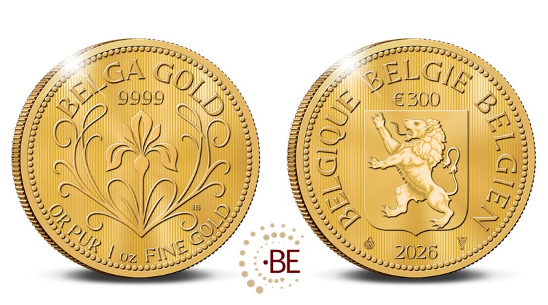 The Belga Gold bullion and investment coins are a tribute to the rich Belgian history and culture especially on the occasion of the centenary anniversary of the issue of the Belga. The bullion-quality coins are produced by the Royal Dutch Mint at their facilities in Houten, Netherlands under license of the Royal Belgian Mint. Designed by Iris Bruijns of the Royal Mint of Belgium, the obverse features a stylised iris, the flower is regarded as a symbol of the capital city of Brussels and is centred. Above the primary design and along the upper rim ids the text BELGA with the metal’s fineness of 9999 placed just underneath. Along the lower rim are the coins’ specifications OR PUR 1 oz FINE GOLD and OR PUR ¼ oz FINE GOLD. The reverse side depicts a modern and simplified version of the Belgian crest that includes a heraldic lion on a shield, centred. Above the crest is the denomination shown as €300 (one ounce) or €75 (quarter ounce). Surrounding the crest along the rim is the country name in the three national languages BELGIQUE BELGIË BELGIEN. Below the crest are the year of issue, 2026 and the mintmarks of the Royal Belgian Mint and Royal Dutch Mint, an Erlenmeyer flask with an aster (left) and the Mercury staff (right). Both obverse and reverse include a pattern of fine raised relief vertical lines in the field as both a means of security and design aesthetic purposes.