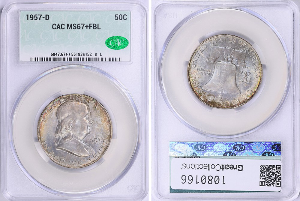 5. On Jan. 4, GreatCollections sold a CACG graded MS-67+ 1957-D half dollar for $8,118. On Nov. 2, GreatCollections sold an NGC graded MS-67+ 1957-D half dollar, without a CAC sticker, for $1,933.80, less than one-fourth as much. Both coins received a ‘Full Bell Lines’ (FBL) designation from the respective grading service.