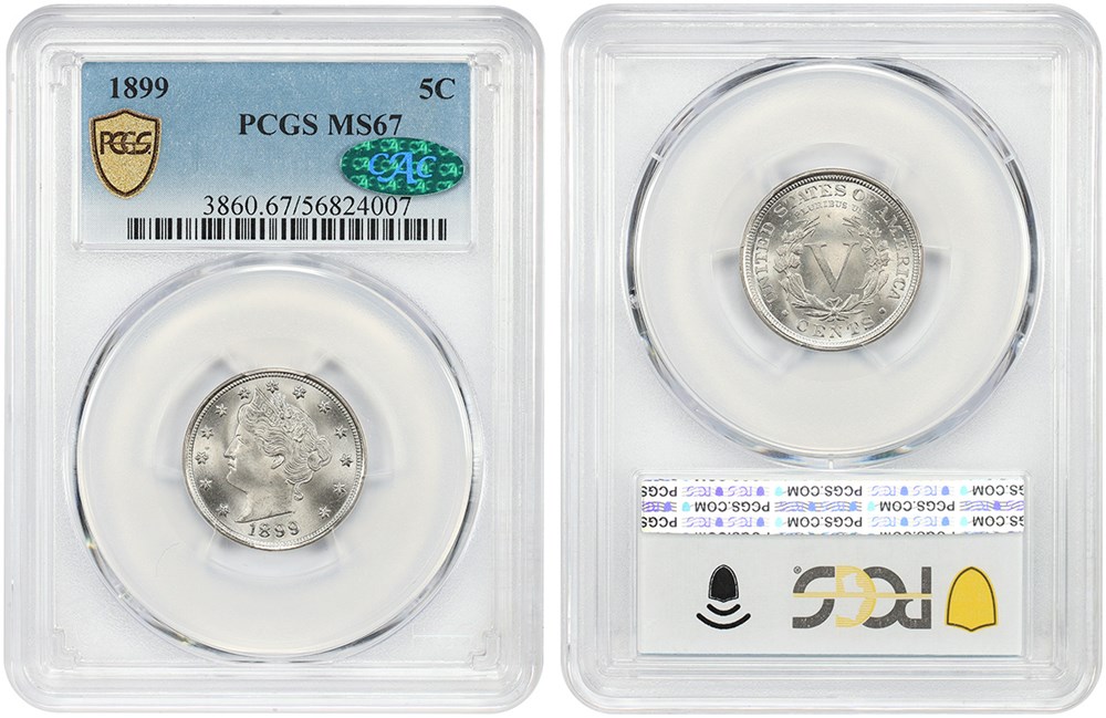 1. On Jan. 4, DLRC sold a CAC approved MS-67 grade 1899 Liberty Head nickel for $6,250. On April 13, GreatCollections sold a PCGS graded MS-67 1899 nickel, without a CAC sticker, for $3,249.40. Market values for these were not higher in January 2026 than they were in April 2025.
