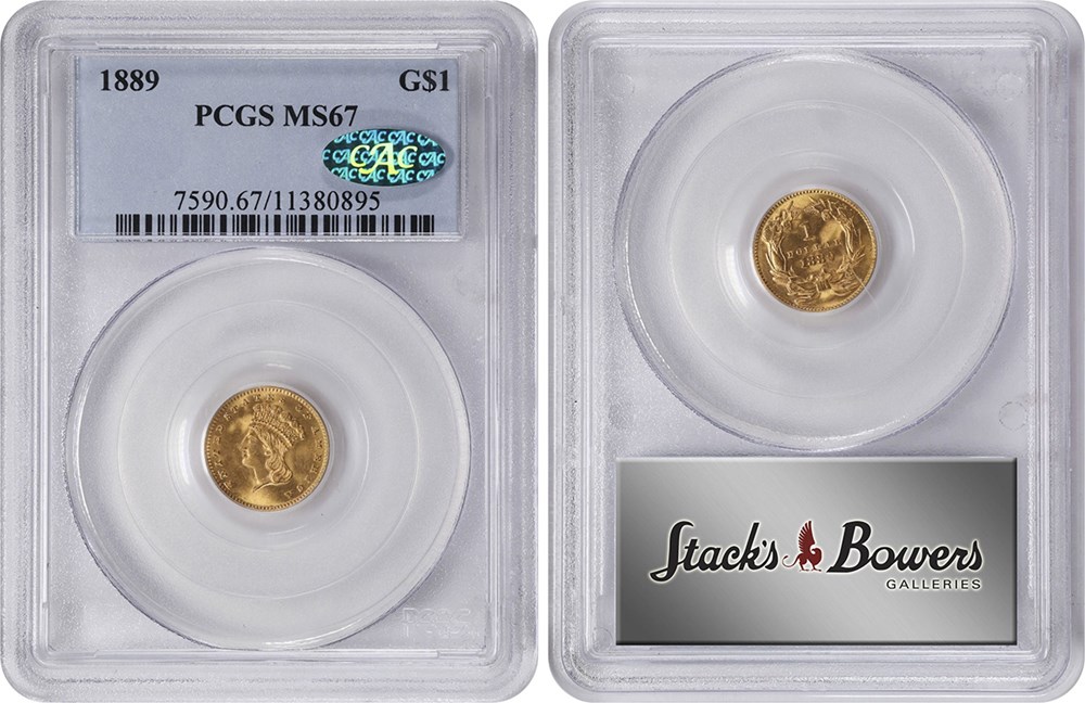 8. On Jan. 14, Stack’s Bowers sold a CAC approved MS-67 grade 1889 One Dollar Gold piece for $3,120. On Jan. 17, Heritage sold an NGC graded MS-67 1889 One Dollar Gold piece, without a CAC sticker, for $2,257. On Dec. 23, Stack’s Bowers sold a PCGS graded MS-67 1889 One Dollar Gold piece, without a CAC sticker, for $2,520.