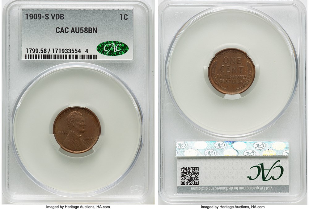 10. On Jan. 17, Heritage auctioned multiple 1909-S VDB Lincoln cents in successive lots. A CACG certified AU-58-Brown 1909-S VDB realized $2,806. The next lot was a PCGS graded AU-58 coin, without a CAC sticker, which realized $2,074. Heritage then auctioned two PCGS graded MS-62 1909-S VDB Lincoln cents, for $2,074 and $2,135, respectively.