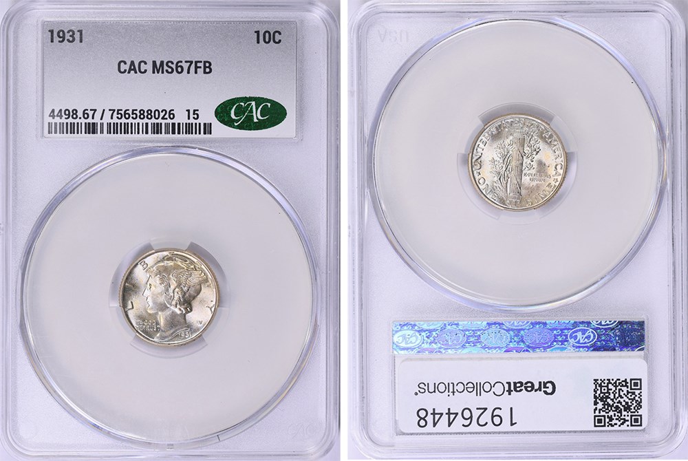 7. On Sept. 14, GreatCollections sold a CACG certified MS-67-FB 1931 dime for $5,827.80. On April 1, 2025, Stack’s Bowers auctioned a PCGS certified MS-67-FB 1931 dime, without a CAC sticker, for $3,120. On Aug. 11, 2024, GreatCollections sold a PCGS certified MS-67-FB 1931 dime, without a CAC sticker, for $2,255. On May 9, 2024, Heritage sold two PCGS certified MS-67-FB 1931 dimes, neither of which had a CAC sticker, and each realized $2,640. All of these have a ‘Full Bands’ (FB) designation from a grading service.