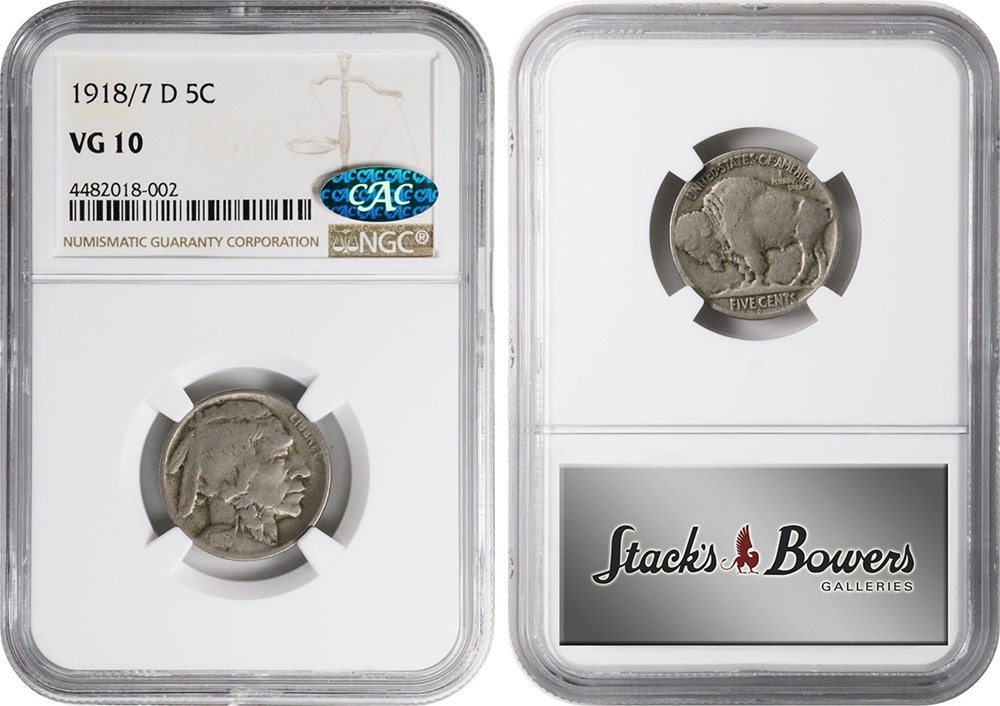 4. On Sept. 10, Stack’s Bowers sold a CAC approved, NGC graded VG-10 1918/7-D overdate Buffalo nickel for $1,680. VG-10 grade 1918/7-D overdates are not auctioned often. On April 8, Stack’s Bowers sold a PCGS graded VG-10 1918/7-D overdate Buffalo nickel, without a CAC sticker, for $1,140. Back on May 28, 2024, Heritage sold a different PCGS graded VG-10 1918/7-D overdate Buffalo nickel, without a CAC sticker, for $1,170.