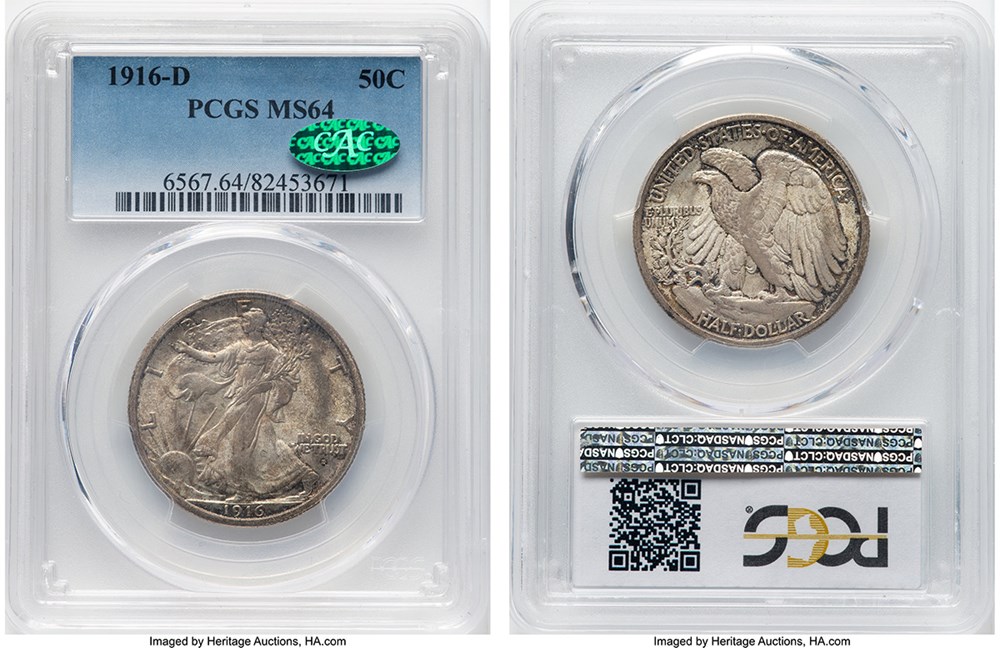 1. On Sept. 2, Heritage sold a CAC approved MS-64 grade 1916-D Walking Liberty half dollar for $1,440. On Aug. 17, GreatCollections sold a PCGS graded MS-64 1916-D half dollar, without a CAC sticker, for $1,163.80.