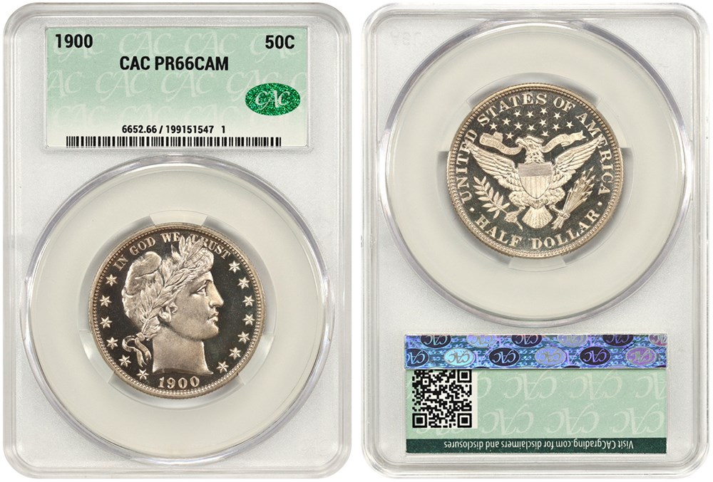 11. On Sept. 21, DLRC sold a CACG certified Proof-66-Cameo 1900 half dollar for $5,250. On May 1, Heritage sold an NGC certified Proof-67-Cameo 1900 half dollar, without a CAC sticker, for $5,040. An immediate point is that a CACG graded 66 coin brought more than an NGC certified Proof-67 1900 half. Each of the two was designated as having a Cameo contrast.