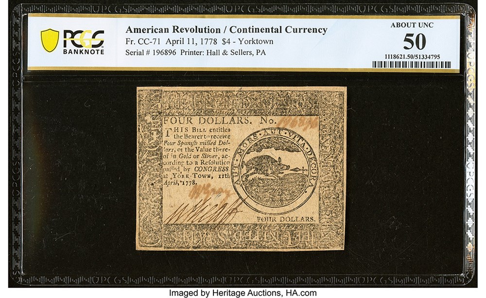 Topping the sale was a Continental Currency April 11, 1778 $4 graded PCGS Banknote About Uncirculated 50, which realized $10,980. Authorized by Acts passed at Yorktown (York, Pennsylvania), the April 11, 1778 emission is widely regarded as the scarcest Continental issue, due in part to extensive counterfeiting efforts intended to undermine confidence in the young nation’s paper money. The emblematic boar charging a spear, paired with the Latin motto AUT MORS AUT VITA DECORA (“Either death or an honorable life”), encapsulates the era’s urgency and resolve; the reverse’s nature print and the Hall & Sellers imprint underscore the period’s evolving mechanics of printing and authentication.