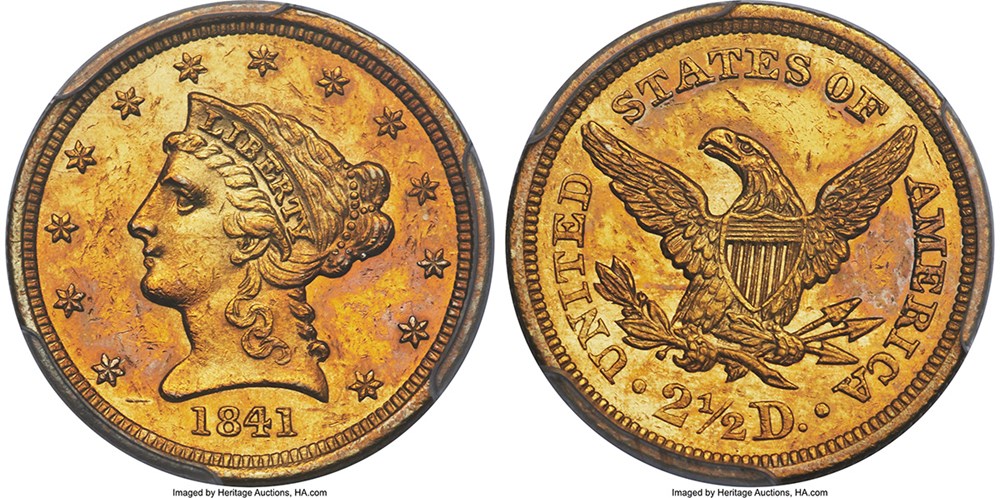 Many of the auction’s top lots are not part of a featured collection. Among them is the finest-certified business-strike 1841 Liberty Quarter Eagle MS61 PCGS. The 1841 Liberty quarter eagle is a landmark rarity in the popular U.S. gold series, of which the surviving population has been estimated by Dannreuther at 14-18 in all grades and by PCGS CoinFacts at 12-13 in business strike formats, including four proofs. Between them, PCGS and NGC have combined to certify 18 coins, a total that includes an unknown number of resubmissions and crossovers. Three examples are housed in institutional collections at the Smithsonian Institution and the Connecticut State Library.