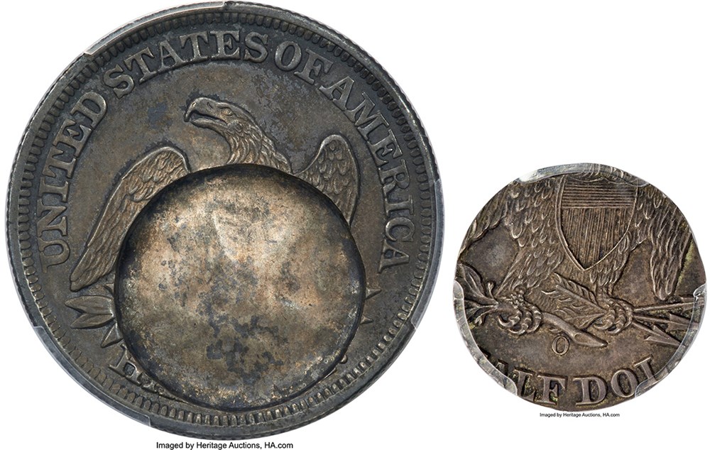 Lot #3097: 1860-O 50C Half Dollar -- Indented by Half Dime Planchet, Mated Pair -- MS63 PCGS.