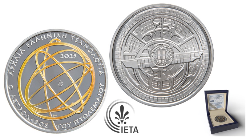 Designed by George Stamatopoulos, chief engraver, the obverse side features a depiction of Ptolemy’s astrolabe which is based on a reconstruction of the instrument by the Kotsanas Museum of Ancient Greek Technology located in Athens. Above the spherical model of the rete which is centred is the inscription placed above the primary design along the upper rim ΑΡΧΑΙΑ ΕΛΛΗΝΙΚΗ ΤΕΧΝΟΛΟΓΙΑ (Ancient Greek Technology) and the additional text Ο ΑΣΤΡΟΛΑΒΟΣ ΤΟΥ ΠΤΟΛΕΜΑΙΟΥ (Ptolemy’s Astrolabe) placed along the lower rim. The year of issue, 2025 is seen just within the sphere to the upper right and the distinctive mintmark of the Greek Mint, a stylised palmette is shown almost in the centre of the coin. The reverse design replicates the plates and guides of the part of the astrolabe known as the tympan. Centred is a small crest of the Hellenic Republic and includes the text ΕΛΛΗΝΙΚΗ ΔΗΜΟΚΡΑΤΙΑ (Hellenic Republic) as well as the denomination of 10 ΕΥΡΩ which encircles the crest.