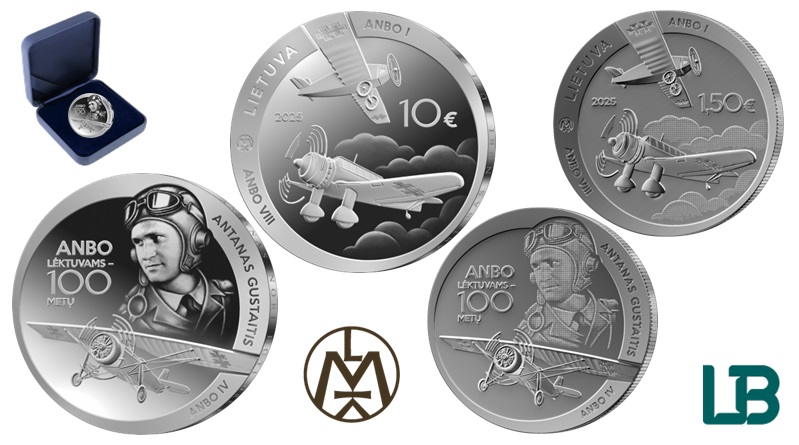 The silver and cupro-nickel coins are produced by the Lithuanian Mint at their facilities in Vilnius on behalf of the Bank of Lithuania and designed by coin artist Tomas Dragūnas. The obverse side of the coin is shared on both base metal and silver strikes features a portrait of the ANBO’s designer shown in a pilot’s helmet and goggles placed to the right side and looking to the left. Just below, a stylised image of the military ANBO IV model aircraft, the inscription ANTANAS GUSTAITIS and ANBO IV is placed along the right rim shown as recessed text. The commemorative text ANBO LĖKTUVAMS – 100 METŲ (ANBO aircraft – 100 years) is positioned just to the left of the portrait of Gustaitis. The reverse side the coin features two images of ANBO models, at the top is the model I flying in an easterly direction and below, the model VIII flying west. Along the upper rim is the text ANBO I shown recessed and to the left rim is the text LIETUVA. The name of the second model airplane ANBO VIII is shown near the lower rim. The distinctive mintmark of the Lithuanian Mint separates the two inscriptions. The denomination 10 € is seen to the right of the model I airplane and the year of issue, 2025 is placed to the left.
