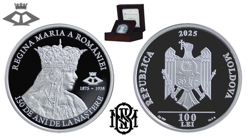 The silver proof coins are produced by the Monetăria Statului, Romanian State Mint at their facilities in Bucharest on behalf of the National Bank of Moldova. The obverse side depicts Queen Marie wearing a custom gold crown made especially for the occasion of the coronation of the Royal couple in 1922 and from gold mined in Transylvania. The medieval style is inspired from a fresco of the Curtea de Argeş Monastery and with side pendants specific to Byzantine imperial diadems. Above the portrait and along the upper rim is the inscription REGINA MARIA A ROMÂNIEI. Below, and along the lower rim is the additional text 150 DE ANI DE LA NAȘTERE (150 years of birth) To the right of the Queen’s likeness is her crowned M monogram. The reverse side features the official Moldovan crest centred with the text REPUBLICA MOLDOVA placed along the rim on either side of the crest. The denomination 100 LEI is shown just below along the lower rim and the year of issue, 2025 is shown above.
